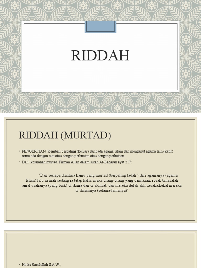 Riddah Ar perbuatan keluar drpd agama Islam sama ada melalui perbuatan perkataan atau niat. Pada postingan di atas pengertian dari kata riddah berasal dari beberapa sumber bahasa dan.